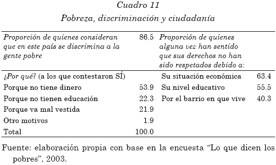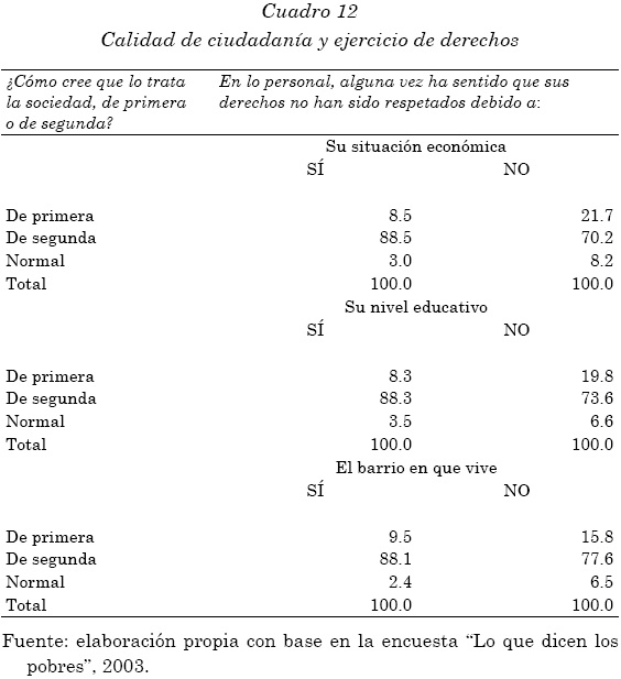 Percepciones y experiencias, ciertamente, no están disociadas: 9 de cada 10 entrevistados considera que en este país se discrimina a los pobres, entre otros motivos, por la falta de dinero (53.9%), de educación (22.3%) y porque "se visten mal" (21.9%) y 6 de cada 10 han sentido personalmente vulnerados sus derechos por su situación económica y su nivel educativo (cuadro 11). Entre quienes se consideran tratados como ciudadanos de segunda (82.2%), 9 de cada diez expresan que en lo personal alguna vez sus derechos han sido violados debido a su situación económica, su nivel educativo y el barrio en que vive (cuadro 12).