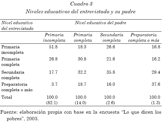 Como se observa en el cuadro 3, las oportunidades de superación educativa en términos intergeneracionales entre quienes provienen de hogares con bajos niveles educativos son muy limitadas. Entre quienes proveyeron información acerca del nivel educativo del padre (84% de los entrevistados), 4 de cada 5 provienen de hogares donde el padre nunca asistió a la escuela o no completó la educación primaria. En este grupo, de cada 10 entrevistados: 5 se mantuvieron en el mismo nivel educativo (primaria incompleta), menos de 3 completaron la educación primaria, 2 el nivel secundario y apenas 3.7% logró completar el nivel de preparatoria. Es decir, sólo 2 de cada 10 entrevistados provenientes de hogares donde el padre no completó la educación primaria lograron acceder a educación posprimaria.