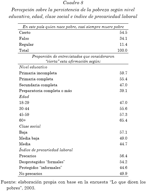 El carácter persistente y hereditario de la pobreza, la rigidez de la estructura social y la altamente precaria e inestable inserción laboral de los sectores más desfavorecidos se expresa en escasas expectativas de mejorar su situación en un contexto donde la pobreza emerge como un destino social. Las desventajas iniciales no sólo se mantienen, sino que se profundizan durante el curso de vida. En este contexto, las oportunidades de escapar de la pobreza se reducen y el margen de maniobra se restringe: más de la mitad de los entrevistados considera que en México el que nace pobre, casi siempre muere pobre.