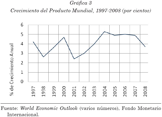 El desempeño y el dinamismo del sistema se miden y se monitorean combinando las tasas de crecimiento del PIB de cada una de las economías "nacionales" en una tasa agregada para todo el conjunto. De acuerdo con el FMI, la "economía internacional" registró un crecimiento de 4.9% en 2005 y de 5.0% en 2006, su mayor expansión en tres décadas (gráfica 3).
