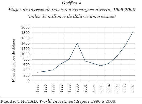 La Comisión de Comercio y Desarrollo de la ONU (UNCTAD) habla, por su parte, de un crecimiento igualmente sostenido de la inversión extranjera directa (IED) en el mundo a partir de 2004 a tasas crecientes que alcanzaron 27% en ese año llegando a 30% en 2007, lo cual fue interpretado como otra manifestación del dinamismo registrado por la "economía internacional" en esos años (gráfica 4).