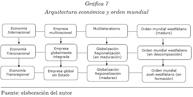 Como se mostró también, la economía global de redes vigente hoy en día se está convirtiendo en una arquitectura transregional que será la contraparte económica del orden mundial post-westfaliano que se gesta actualmente. Este orden estará constituido por una amplia diversidad de actores que van desde Estados-nación, organismos e instituciones, hasta entidades regionales y otras de carácter no territorial; por lo tanto entrañará un nuevo mapa del mundo que ya no será exclusivamente internacional sino predominantemente interregional.