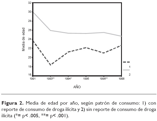 En la figura 2 puede observare que esta diferencia en el patrón de consumo con relación a las medias de edad es constante en todos los años, siendo significativa en 1993 (p<.001), 1994 (p<.005) y 1996 (p<.001).