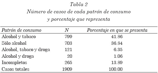 Además de calcular el porcentaje de consumo de alcohol reportado, se buscó la presencia de consumo de alcohol asociado con el uso de tabaco y/o de otras drogas en la población. Entre los 1,909 casos se detectaron cuatro patrones de consumo: sólo alcohol; alcohol y tabaco; alcohol y alguna droga ilícita (pero no tabaco) y alcohol, tabaco y droga.