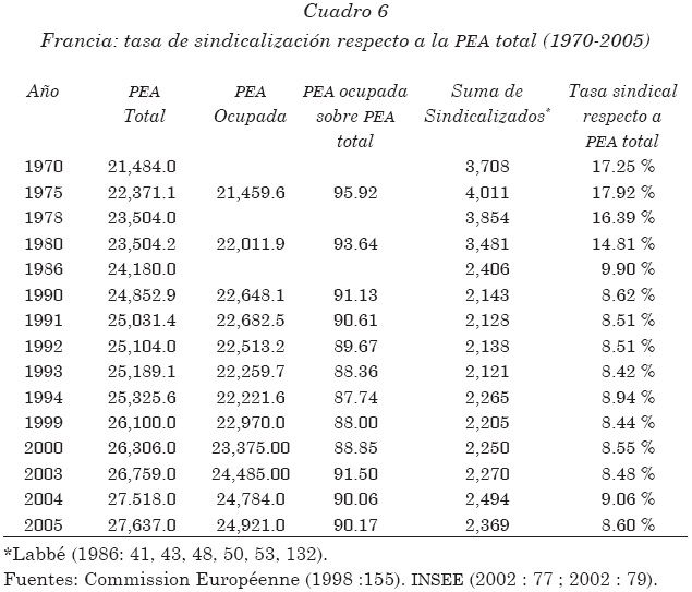 Para 1986, la suma de sindicalizados en Francia bajó a los 2.40 millones de personas, mismos que representaron 9.90% de la población activa; fue un descenso pronunciado respecto a 1980 (véase cuadro 6).