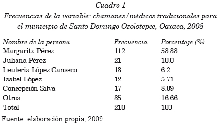 Lo anterior puede visualizarse en el cuadro 1. Este cuadro es un ejemplo y representa nada más a la variable chamanes/médicos de un municipio. Las cuatro variables mencionadas en el apartado de metodología se trabajaron en forma similar en cada uno de los tres municipios considerados en este trabajo. Con la información completa del cuadro 1, es decir, incluyendo las cuatro variables y considerando a los tres municipios, se obtuvo los nombres de las personas a las cuales se les aplicó la entrevista etnográfica clásica (cuadro 2).