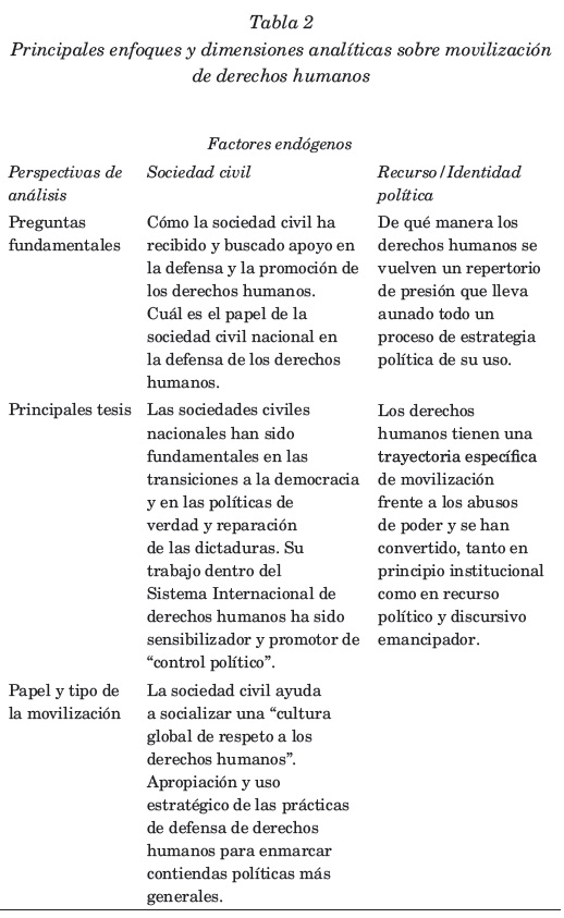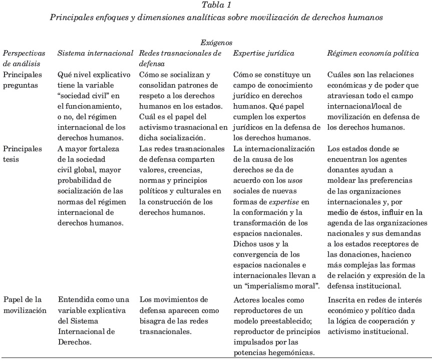 En síntesis, es importante señalar que los enfoques teóricos concentrados en los factores exógenos de la movilización, que llamamos como de análisis del régimen internacional y actores de presión "desde afuera", se concentran en cuatro puntos: a) el análisis de las variables que inciden en la ratificación de tratados y el respeto de los derechos humanos; b) el estudio de la reproducción y la socialización de la normatividad de derechos humanos, donde la movilización local aparece como vínculo o bisagra con las redes trasnacionales; c) la producción y la reproducción de un saber experto que involucra a diversos actores, que está determinado por los principios valorativos y normativos de los derechos humanos, además de la fuerte dependencia económica con las redes donantes, lo que hace aparecer, en estas perspectivas, a los actores locales como una especie de reproductores de un modelo preestablecido; d) el análisis del régimen internacional de derechos humanos como un marco de posibilidades de distribución de poder en los estados, donde el movimiento de derechos humanos es un actor importante en la concentración y la distribución de posibilidades de acción política.