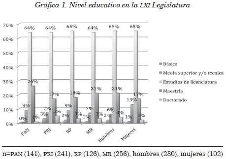 En promedio, el 65% de los diputados analizados tienen licenciatura y alrededor del 20% un posgrado. La educación técnica y básica cuenta con porcentajes bajos; cifras que denotan la existencia de una educación superior entre los diputados federales.