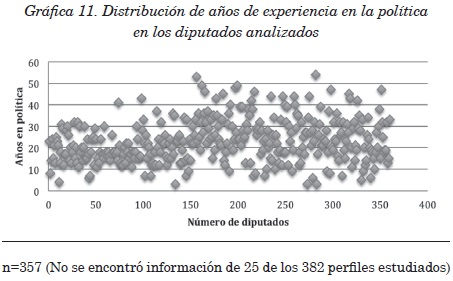 La tercera variable analizada se refiere a la experiencia política y para ello se observaron los siguientes indicadores: promedio de años en la política, experiencia en participación voluntaria previa al cargo público, en dirigencia partidista, en puestos de confianza y en cargos de elección popular. Es importante recalcar que la experiencia política analizada en los diputados es otro indicador que causa diferentes reacciones en la academia y en la opinión pública. En sentido estricto, un político con experiencia beneficiaría al sistema democrático más que uno sin experiencia. Si tenemos enfrente a un diputado con años de experiencia en la actividad legislativa y a un diputado que jamás ha desempeñado un puesto del género nos encontramos con reacciones muy diversas. Para los estudiosos de la democracia y de los políticos, el diputado con mayor experiencia obtendría mejores resultados en su actividad. Para la opinión pública, el diputado novato beneficiaría más a la democracia al no estar "contaminado" de lo que es la experiencia en la política. La primera opinión se refiere a una visión del político como recurso humano del sistema democrático. La segunda es una visión del político como producto de la mala forma de hacer política, percibida por los ciudadanos.