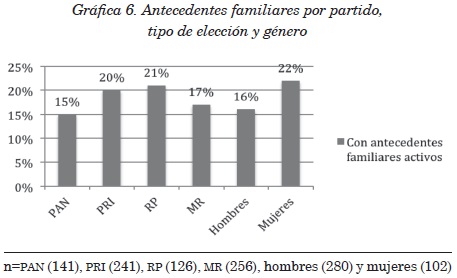 Otro aspecto que ha sido muy analizado en los países recientemente democratizados es la presencia en el Recinto Legislativo de diputados federales con antecedentes familiares activos en la política. Para autores como Gehlbach y Sonin (2004) se ha convertido en un indicador de compadrazgo y de oportunismo. Sin duda, además de los mentores, los antecedentes familiares facilitan el ingreso a la política. Por otro lado, para autores como Alcántara, estos no conforman un indicador fuerte, ya que no todos los hijos de un político se inclinan por la función pública, por lo que está implícito un interés o una vocación política que va más allá del mero parentesco.