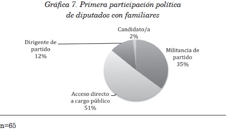 Aquellas variables que más relación tienen con los antecedentes familiares son la de las mujeres, la de los diputados electos por RP y la de los diputados del PRI. Pero siguiendo con las críticas al determinismo de la familia como condición del oportunismo, se amplía el análisis a la primera participación política de los diputados con antecedentes familiares. De los 65 diputados analizados, solamente 33 hicieron trabajo voluntario antes de acceder al cargo público en el partido político. Los otros 34 accedieron directamente a un cargo de confianza.