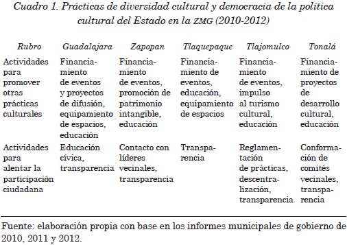 Dicho lo anterior, ahora presento el análisis de contenido de los informes de gobierno y de los planes de desarrollo 2010-2012 de los municipios que integran la ZMG, para la democracia y la diversidad cultural que sustentan las prácticas similares al neoconservadurismo de la política cultural del Estado que acabamos de revisar.