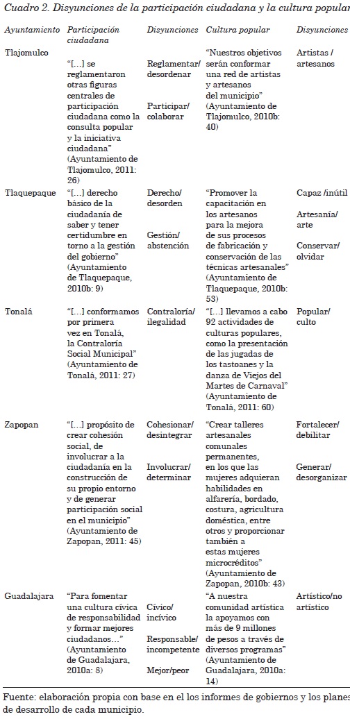 En sintonía con lo expuesto por los diversos autores y para fines de este estudio, entiendo por cultura política todos aquellos significados que dan coherencia y valor a las acciones de la política cultural, así como el sentido al modelo cultural de referencia. En esta parte del texto pretendo identificar el significado de la política cultural del Estado en la ZMG. Entre el océano de propuestas y justificaciones semánticas de las acciones contenidas en los informes de gobierno y los planes de desarrollo 2010-2012 retomaré las categorías usadas en el apartado anterior (democracia y diversidad cultural). Los indicadores que utilizaré son: para el caso de la categoría democracia, la participación ciudadana; en torno de la diversidad cultural, la cultura popular. A partir de los documentos oficiales y con base en las categorías e indicadores, extraje citas literales de los documentos oficiales (consúltese el cuadro 2) y las ordené para analizar su contenido.