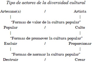 Volviendo con el "análisis estructural", para el caso de la cultura popular y tomando en cuenta que quienes construyen esa cultura son nombrados por las propias instituciones del Estado en los documentos oficiales como "artesanos",15 la disyuntiva queda representada como sigue: