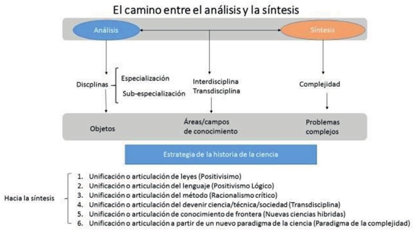 En resumen, si bien el pasado, a partir del surgimiento de las ciencias modernas, privilegió el análisis como el canon o modelo de hacer ciencia, lo cual permitió a las distintas ciencias importantes descubrimientos y aplicaciones, las cosas han empezado a cambiar desde hace algunos decenios. El análisis significó dividir, separar, fragmentar o partir los objetos de conocimiento y en esa división descuidó el reunir, volver a integrar, dar cuenta del conjunto de lo separado. Tal como escribe Carlos Maldonado:
