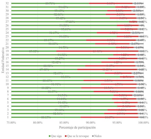 Como se puede observar, las entidades gobernadas por la coalición “Juntos Hacemos Historia” tuvieron una votación favorable a la continuidad del presidente Andrés Manuel López Obrador. En 24 entidades (Baja California, Baja California Sur, Campeche, Coahuila, Colima, Chiapas, Chihuahua, Durango, Guerrero, Hidalgo, Michoacán, Morelos, Nayarit, Oaxaca, Puebla, Quintana Roo, San Luis Potosí, Sinaloa, Sonora, Tabasco, Tamaulipas, Tlaxcala, Veracruz y Yucatán) el apoyo al presidente fue superior al 90 %. Mientras que en algunas entidades donde gobierna la oposición partidista, como Aguascalientes, Guanajuato, Jalisco, estado de México y Nuevo León, también se refrendó la continuidad presidencial, aunque con una tasa inferior al 90 %.