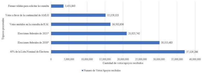 De acuerdo con los porcentajes de votación obtenidos en otros procesos, puede afirmarse que el resultado de la revocación del mandato hacia el presidente Andrés Manuel López Obrador es susceptible de tener diferentes interpretaciones. Por principio, no se alcanzó una participación ciudadana del 40 % para su vinculatoriedad, en segundo lugar, la votación en favor de la coalición gobernante fue mayor en las elecciones federales de 2018 y 2021, además de que se presentó un abstencionismo superior al 80 %. No obstante, también debe de considerarse que el mandatario obtuvo más de quince millones de votos, logró obtener una participación mayoritaria en favor de la continuidad del presidente en la mayoría de las entidades federativas y, de igual forma, superó la cantidad de firmas solicitadas para la consulta. Derivado de esto, se presentaron dos narrativas contrapuestas. Por un lado, el oficialismo no tardó en señalar que el proceso había sido exitoso, pues el apoyo al mandatario fue abrumador; por otro lado, sus opositores señalaron que la consulta “quedará marcada por la ilegalidad, la mentira, la manipulación y el desvío de recursos públicos; mal precedente para una verdadera consulta de revocación de mandato” (Ramos, 2022). De acuerdo con el resultado se desprenden dos datos relevantes que se contraponen: el presidente contó con el apoyo significativo de más de quince millones de electores, pero más del 80 % de la ciudadanía se abstuvo de participar, lo que significa que hubo poco interés por este ejercicio.