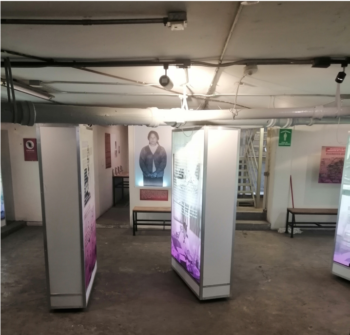 Otra parte de la estructura museográfica se encuentra al fondo del sótano, donde hay dos pequeñas habitaciones, en una de ellas se encuentra la fotografía de José Ignacio Olivares -de la LC23S, asesinado por agentes estatales, cuyo cuerpo fue abandonado en Guadalajara, Jalisco-, además de actantes no humanos (Lussault, 2015), específicamente charolas y credenciales de agentes pertenecientes a la DFS, además de pequeños recuadros alusivos a las diversas formas de tortura ejecutadas por la DFS. Asimismo, hay cuadros que llevan los nombres de algunas de las víctimas del periodo de contrainsurgencia estatal. En el segundo cuarto también hay fotografías de otras víctimas. La museografía fue realizada por Cinthia Bernal y Alfonso Zárate (Informante 1 de la DGEADH, entrevista personal, 14 de junio de 2023).