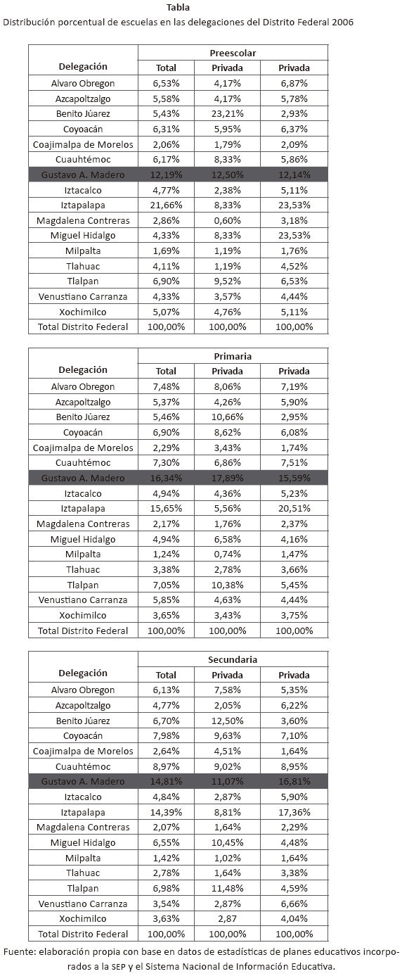La delegación Gustavo A. Madero del Distrito Federal concentra la mayor proporción de organizaciones educativas, tanto en el total como en cada subnivel educativo, a excepción de preescolar, en la que es superada por Iztapalapa.