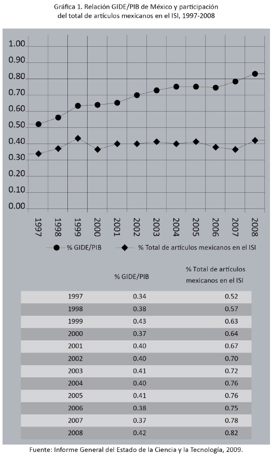 El total de las publicaciones en el ISI de los investigadores mexicanos ha sido poco significativo, ya que durante cada año comprendido de 1997 a 2008 dicha participación no rebasó uno por ciento del total de artículos publicados en el ISI. No obstante, resalta el comportamiento creciente del total de artículos mexicanos publicados en algunas revistas del ISI respecto al incremento en el gasto en investigación y desarrollo experimental (GIDE) de México (véase gráfica 1).