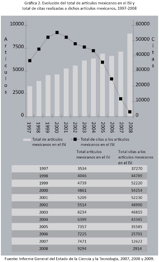 A pesar de que el número de citas realizadas a los trabajos de los investigadores mexicanos, publicados en el ISI, mostró una clara disminución a través del tiempo, se debe resaltar el hecho de que el número de artículos mexicanos en el ISI sigue aumentando al paso de los años. Hay que mencionar que los artículos más recientes, publicados por algunas revistas del ISI, de los investigadores mexicanos aún no han capitalizado el total de sus potenciales citas, por lo que, sin duda, esto influye de manera directa sobre el comportamiento de al menos los últimos cinco años (véase gráfica 2).