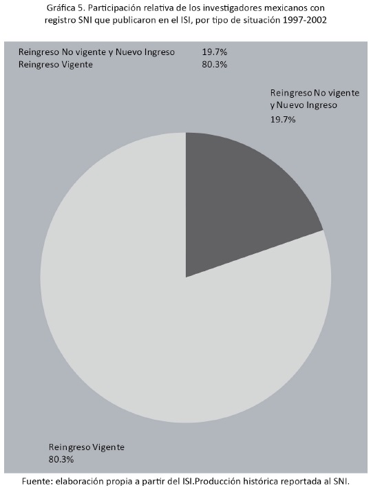 Los investigadores mexicanos con registro vigente en el SNI tuvieron una participación relativa muy considerable durante 19972002 en cuanto a las publicaciones del ISI se refiere, ya que 80.3% de todos los investigadores con registro vigente en el SNI se involucraron en los trabajos difundidos por algunas revistas del ISI (véase gráfica 5).