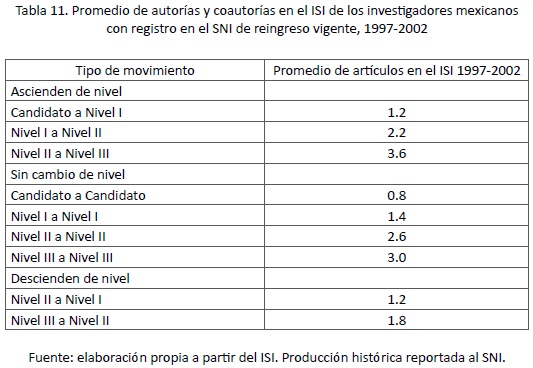 En la tabla 11 se aprecia que, durante 19972002, el total de investigadores mexicanos vigentes en el SNI, promovidos a un nivel superior dentro de dicho sistema de investigación, contabilizaron un promedio de 2.3 autorías o coautorías en el ISI. Por su parte, para los investigadores mexicanos que no mostraron cambio de nivel dicho promedio fue de 2.0 autorías o coautorías en el ISI y, finalmente, para los investigadores mexicanos que descendieron de nivel en dicho sistema el promedio fue de 1.5 autorías o coautorías en el ISI.