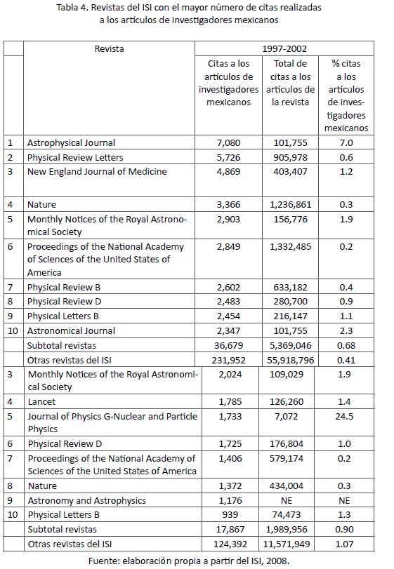 En lo relacionado con la coherencia entre las disciplinas del ISI con el mayor número de artículos mexicanos y el mayor número de citas recibidas en ambos periodos de estudio, se puede apreciar que para 20032008 la correspondencia entre los dos conceptos fue menos dispersa.Lo que sí queda claro es que los investigadores mexicanos que publicaron en las disciplinas del ISI denominadas Physics, Multidisciplinary y Astronomy & Astrophysics fueron los más productivos y los que más citas han contabilizado en dichos periodos. Además, para las revistas del ISI con el mayor número de artículos de investigadores mexicanos publicados en cada etapa de estudio se encontró que la Revista Mexicana de Física encabezó dicho concepto en ambos periodos (véase tabla 3). No obstante, todas estas revistas fueron de carácter teóricoexperimental y ninguna de ellas pertenece al ámbito social o de humanidades.