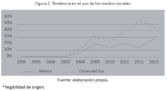 Según los resultados, en México, el año de transición en el uso de los medios sociales en educación superior fue 2013 (26.7%), mientras que en Corea del Sur, 2012 (39.1%) (ver figura 2 como referencia).