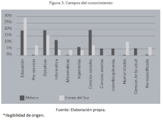Como se puede apreciar en la figura 3, en México las campos del conocimiento en donde se implementaron los medios sociales son: ciencias sociales, 20% en programas académicos como Psicología, Ciencias de la Comunicación y Administración; educación, 20% en asignaturas como Ambientes Virtuales y Práctica Docente, o maestrías en Pedagogía y en Tecnología Educativa; materias optativas, 20% para el desarrollo de competencias de lectura y escritura, debate en foros de discusión y el desarrollo integral del universitario. Otros campos son: ciencias computacionales, 13.3%; ingenierías, 6.7%; ciencias exactas, 6.7%; interdisciplinares, 6.7%; ciencias de la salud, 6.7%. Por otro lado, en Corea del Sur el área que más incidencias tuvo es en educación, con 30.4%, en asignaturas como Tecnología Educativa y Métodos de Instrucción. Otros campos fueron materias optativas, 17.4%; humanidades, 13%; preservicio, 8.7%; ciencias sociales, 8.7%; no especificado, 8.7%; ingenierías, 4.4%; ciencias computacionales, 4.4%; y matemáticas, 4.4%.