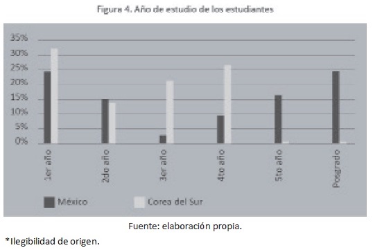 La figura 4 muestra el año de estudios de los estudiantes. En ambos países, el uso de medios sociales se relaciona con los estudiantes de nuevo ingreso: en México con 25% y en Corea del Sur con 33.6%. Esto es comprensible desde la perspectiva de Prensky (2001), quien sugiere que los jóvenes, que nacieron en la "era digital" y son llamados nativos digitales, traen consigo diferentes preferencias, habilidades y formas de procesar la información a través del uso de la tecnología. En este punto, es preciso señalar las aportaciones de Herrera-Batista (2009) y Ortega y Banderas (2011), que describen a los estudiantes de nuevo ingreso de las universidades mexicanas con un mayor acceso a internet y preferencias de recursos tecnológicos para realizar tareas y participar en actividades cotidianas.