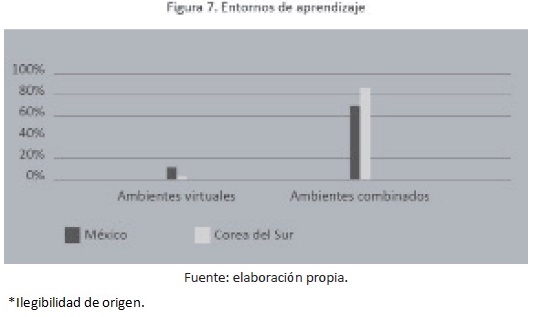 En la figura 7 se muestran los entornos de aprendizaje. En México, el entorno combinado obtuvo 80% y el ambiente virtual, 20%, mientras que en Corea del Sur, el cien por ciento lo alcanzó el entorno de aprendizaje combinado.