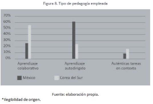 La figura 8 muestra el tipo de pedagogía empleada. En México, el aprendizaje autodirigido obtuvo 66.7%, el colaborativo, 20%, y las auténticas tareas en contexto, 13.3%. En Corea del Sur, el aprendizaje colaborativo obtuvo 50%, el autodirigido, 29.2%, y las auténticas tareas en contexto, 20.8%.