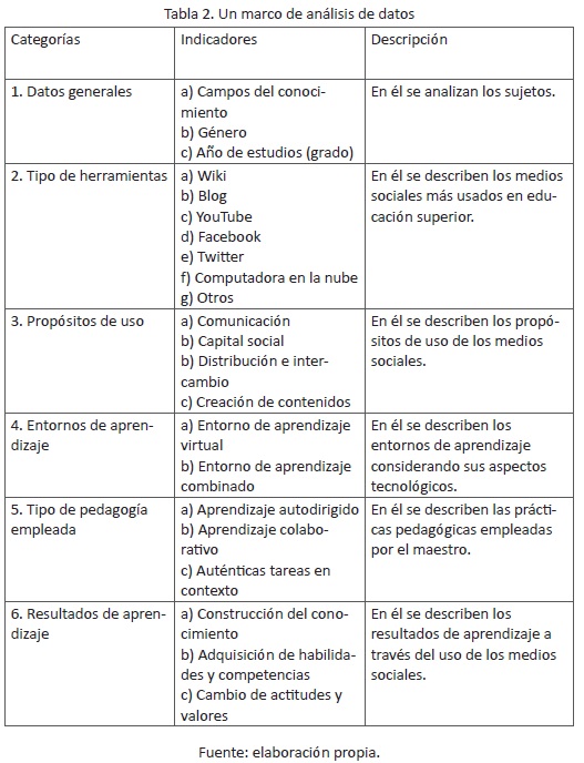 La tabla 2 presenta el marco de análisis de este estudio y fue diseñado en torno a la literatura sobre estudios relacionados con el tema (Jeung, 2010; Bennett. et al., 2012; Davis et al., 2012; Tess, 2013; Nykvist & Lee, 2013).