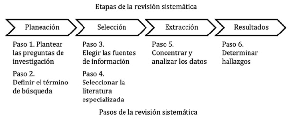 La revisión sistemática de la literatura especializada se elaboró con base en la metodología de metasíntesis, la cual integra los resultados de estudios cualitativos y procesa los datos obtenidos de forma inductiva con la finalidad de interpretar hallazgos relevantes (Leary & Walker, 2018). El principal objetivo fue comprender las tendencias de diseño, validación e implementación de game learning analytics desde 2013, año en el que se registran las primeras investigaciones referentes al tema, hasta 2020. El procedimiento incluyó cuatro etapas y seis pasos, los cuales se detallan en la figura 1 (Grijalva et al., 2019).