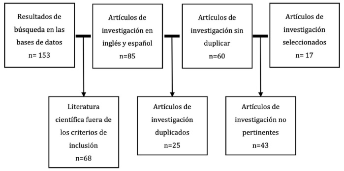La búsqueda referente al término game learning analytics se realizó en 17 bases de datos, de las cuales obtuvimos 153 resultados. Estos fueron filtrados empleando criterios de exclusión e inclusión, análisis de duplicados y pertinencia, lo que arrojó un total de 17 artículos de investigación científica. La tabla 2 contiene los hallazgos por base de datos, así como los artículos