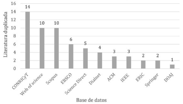 Como fuentes de información, seleccionamos 17 bases de datos e incluimos algunas de las principales para educación, informática e investigación científica general: Scopus, ScienceDirect, SpringerLink, Web of Science, Conricyt, Redalyc, Directory of Open Access Journals, IEEE Xplore, Dialnet, Emerald Insight, EBSCOhost, SciELO, Latindex, Association for Computing Machinery, Education Resources Information Center, Cambridge Journals Online y Oxford University Press.