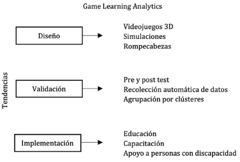 Comprender las tendencias de diseño, validación e implementación de game learning analytics favorece la consolidación de término, y sirve como guía no solo para investigadores de áreas educativas, sino también para desarrolladores o investigadores interesados en elaborar este tipo de recursos. Es importante destacar que las tendencias de diseño para esta analítica de aprendizaje se inclinan a la selección e implementación de un juego serio más que a la elaboración de este, lo cual facilita y pone al alcance el uso de game learning analytics con fines educativos para docentes que cuentan con poca capacitación tecnológica en la elaboración de serious game y learning analytics.