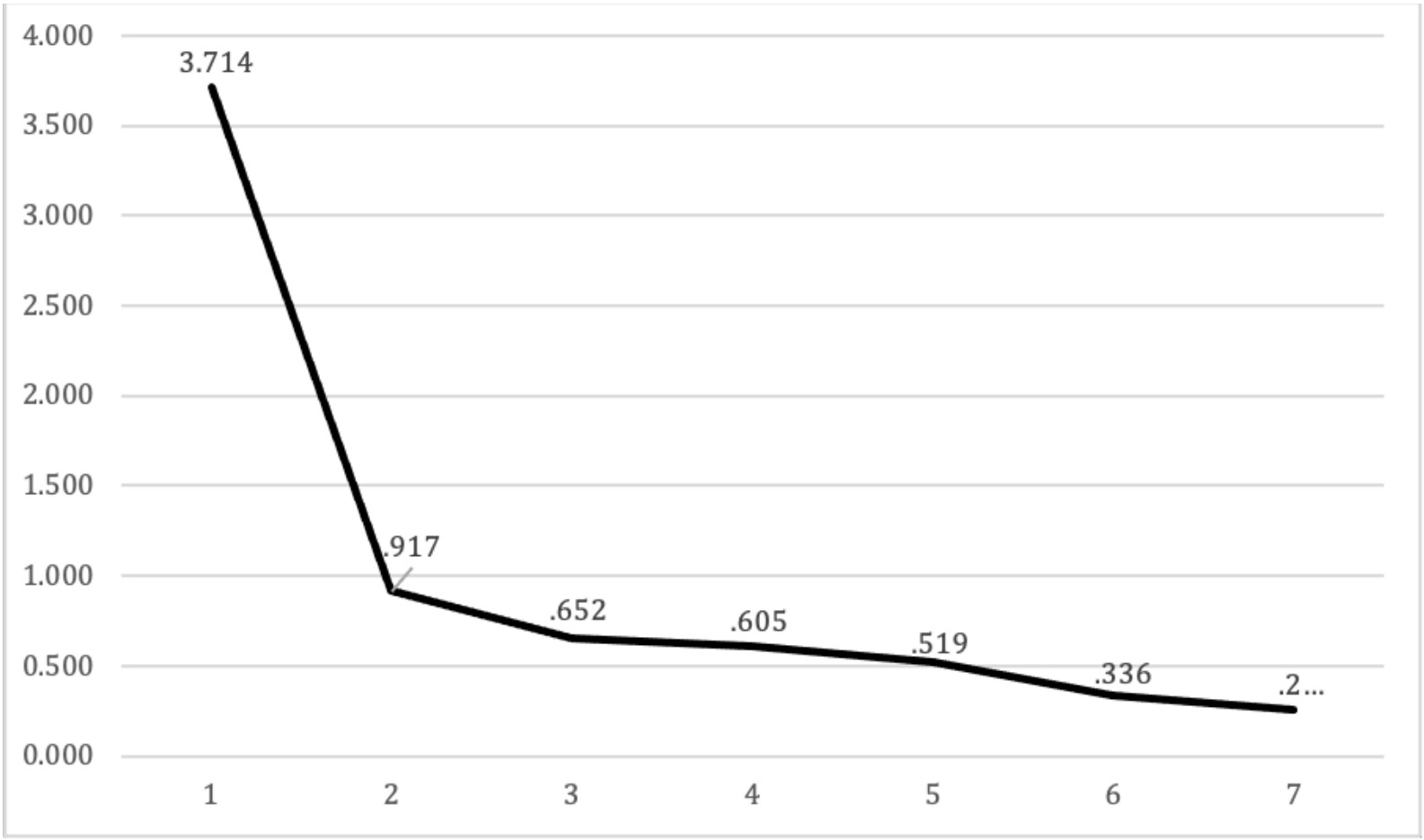 En un siguiente paso, sometimos la escala de uso de TIC a un análisis factorial exploratorio (Taherdoost et al., 2022), el cual alcanzó KMO de .80; la prueba de esfericidad de Bartlett generó una X² de 247.57 con 55 grados de libertad y una p de <.01. El resultado arroja una estructura unidimensional y los ítems 1, 4 y 5 fueron eliminados por tener lambdas o pesos factoriales por debajo de .400; luego de la eliminación de los reactivos, contamos con una varianza explicada del 33.6%.