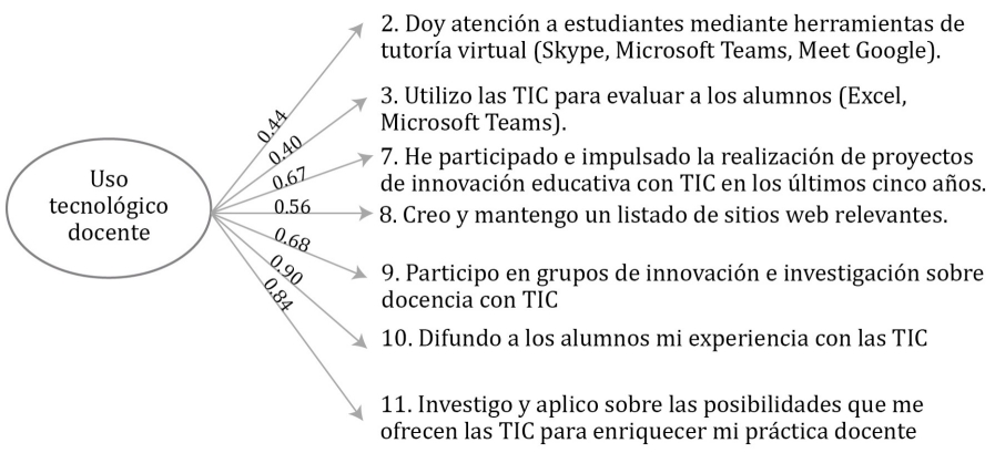 En cuanto a la varianza explicada, esta es menor que la reportada por otro constructo similar, la escala TPACK (Lobos et al., 2022) logró el 62% de la varianza explicada; la bondad de ajuste en esta investigación cumplió con los parámetros adecuados. La escala propuesta por Aslan y Zhu (2017) muestra índices similares, pero con pequeñas diferencias, como el RMSEA, en cuya investigación ajusta de mejor manera y está sujeto al número de indicadores y a las características poblacionales; puede ser mejor siempre y cuando la cantidad de población y número de reactivos aumenten.