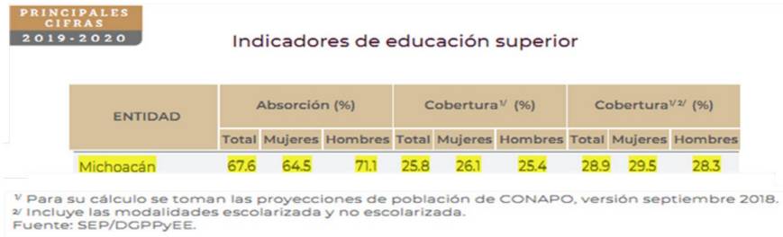 La atención y cobertura de los servicios educativos a nivel superior en general, y la inclusión de los pueblos indígenas en particular, no está estipulada como obligatoria en el artículo 3° constitucional; antes bien, queda a discreción de los estados, por lo que los grupos en rezago y los indígenas se encuentran en una posición de mayor vulnerabilidad, ya que se carece de estructuras y políticas educativas formales que incidan en este punto. A continuación, señalamos algunas notas distintivas del estado de Michoacán, uno de los que tiene mayor índice de rezago y pobreza en el país según estimaciones del Consejo Nacional de Población (2020).
