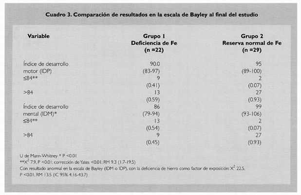 Conclusiones. La deficiencia de Fe en lactantes no anémicos se asocia a menor puntuación de la EB, especialmente del área mental. El crecimiento corporal acelerado es una variable indepediente en el aumento del consumo de Fe.