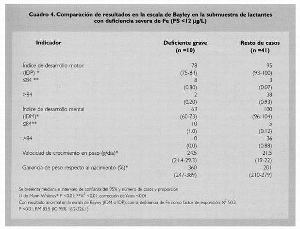 Conclusions. Iron deficiency, even in non-anemic infants, may be associated to a significant score decrease in neurodevelopment scales, particularly in the mental area. The accelerated body growth observed is and independent variable that increases iron consumption in infants.