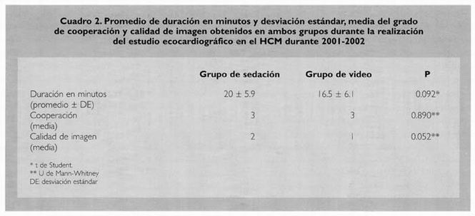 No hubo diferencia significativa entre el grado de cooperación y en la calidad de información obtenida en los estudios ecocardiográficos de ambos grupos, con lo cual se demuestra que la proyección de videos infantiles es una alternativa confiable en cuanto a la información obtenida por ecocardiografía en niños no cooperadores.