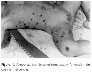 Padecimiento actual: lo inició a los tres años cinco meses de edad con la presencia de una dermatosis diseminada a cabeza, tronco y extremidades, que afectaba región peribucal, tórax, abdomen, glúteos, genitales, brazos y muslos. Se caracterizaba por ampollas con una base eritematosa y formación de costras melicéricas, algunas con distribución de rosetas y lesiones vésico-ampollares, con prurito moderado (Fig. 1).