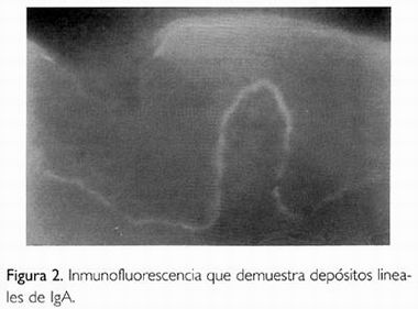 Actualmente el inmunoblot se considera que es un estudio más específico, pero la inmunofluorescencia directa sigue siendo una técnica confiable y más accesible en la práctica clínica 10,11 que demostrará depósitos lineales de IgA en la membrana basal epidérmica. La presencia de IgA lineal fue claramente demostrada en nuestro paciente (Fig. 2).
