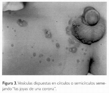 En la piel en su forma más característica, las vesículas se disponen en círculos o semicírculos semejando "las joyas de una corona" (Fig. 3). Las lesiones pueden ser o no pruriginosas.6-8