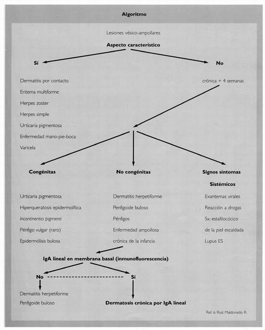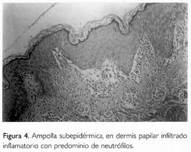 Para el diagnóstico clínico diferencial con otros padecimientos ampollosos véase el algoritmo. En la histopatología de una lesión o de su periferia se encuentra una ampolla sub-epidérmica y en dermis papilar un infiltrado inflamatorio en el que predominan los neutrófilos (Fig. 4).