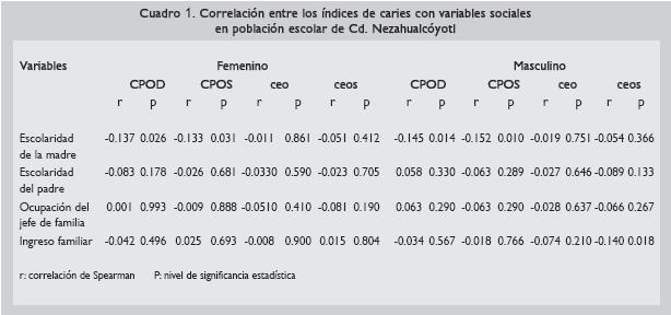 En el cuadro 1 se presenta la correlación entre los índices de caries con las variables sociales, en el cual se puede observar que existe correlación negativa con la variable escolaridad de la madre en el grupo femenino para el CPOD, presentando una r =0.137, P =0.026, lo que significa que a mayor escolaridad de la madre se presenta menor valor en el índice de caries o menor probabilidad de padecer la patología, considerando también que la P menor de 0.05 significa que el resultado no se debe al azar y la "r" muestra el grado de asociación entre las variables, que en este caso es de 13.7%. La correlación entre el índice CPOS y la escolaridad de la madre muestra una r =0.133, P =0.031. Para el grupo masculino se observa correlación con la variable escolaridad de la madre, para el CPOD con una r =0.145, P =0.014; para el CPOS con una r =0.152, P =0.010; asimismo, para la variable ingreso familiar con el ceos mostrando una r =0.140, P =0.018. Es importante mencionar que el CPOD y el ceod muestran una estimación de la prevalencia de caries, mientras que el CPOS y el ceos muestran una estimación de la gravedad del daño.
