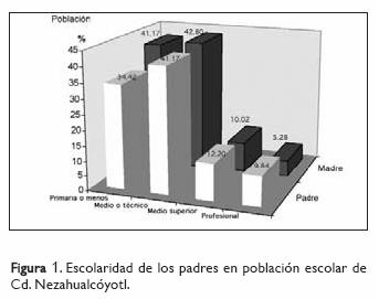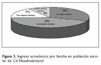 Con relación a la escolaridad de los padres (Fig. 1) se observa que 83.9% de los padres y 75.6% de las madres tiene una formación de nivel medio, técnico o menor; lo que indica que es muy posible que entre 75 y 80% de los padres tengan un empleo medio o subempleo con una percepción de uno o dos salarios mínimos; 74% de los jefes de familia se ocupan en empleos considerados como poco remunerados y con escasa exigencia de capacitación, sólo 8% tiene nivel profesional (Fig. 2); estos datos concuerdan con el ingreso económico por familia (Fig. 3), donde se muestra que 74% percibe entre uno y dos salarios mínimos y sólo 9% gana un equivalente a cuatro o más salarios mínimos. El estrato social conformado por padres de familia con un ingreso superior a cuatro salarios mínimos y con formación y empleo profesionales, están subrepresentados tanto en la muestra como en la población general estudiada. Este estrato es muy pequeño en esa zona del Municipio, por lo que la comparación entre estratos socioeconómicos puede verse limitada por la escasa presencia de padres con el nivel de ingresos mayor a cuatro salarios mínimos.